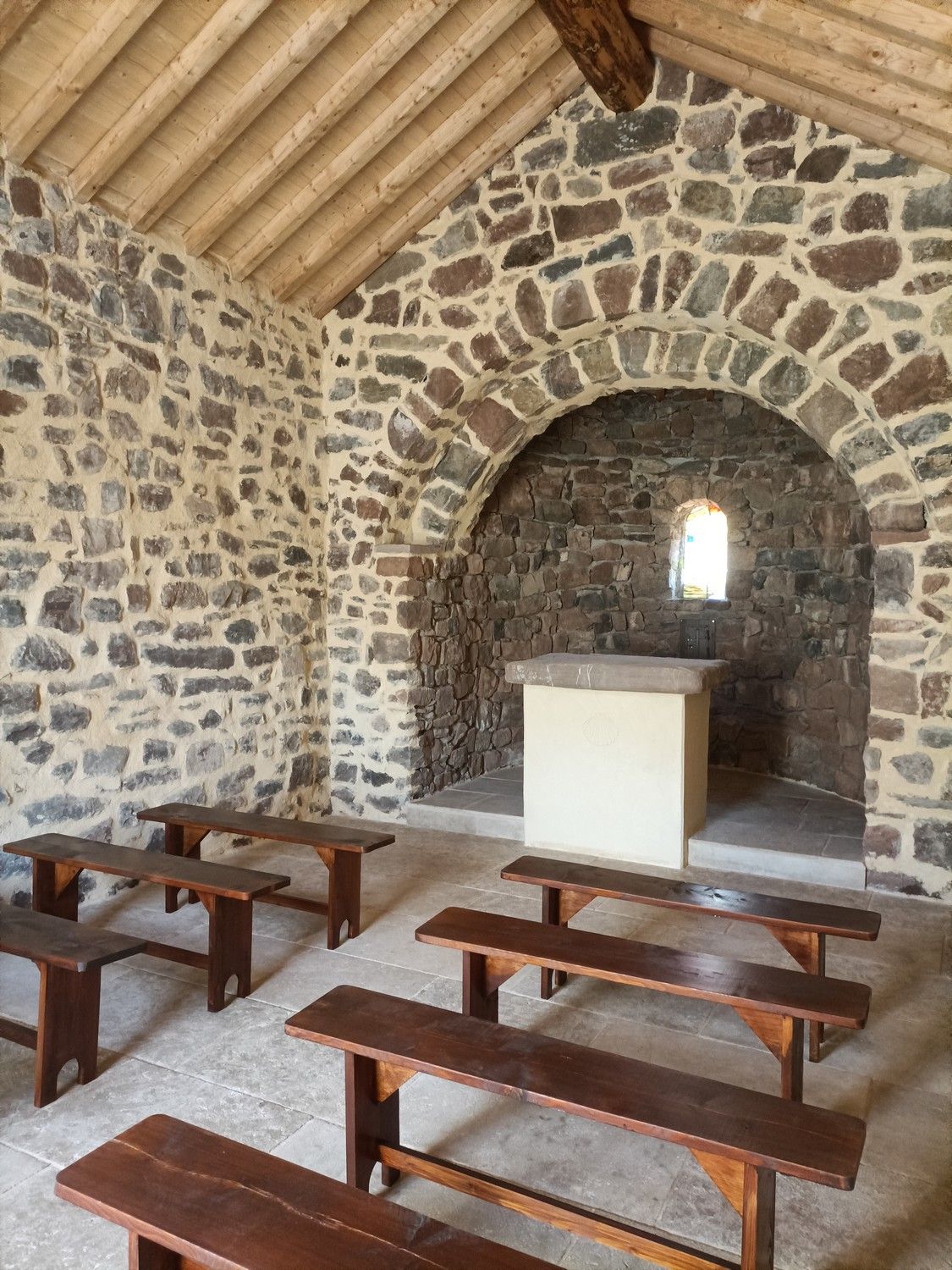 La chapelle, orientée Est - Ouest conformément à la tradition sera reconstruite en s'inspirant des chapelles rurales alpines avec clocher-mur et abside. Ses proportions respecteront le nombre d'or tandis que sa couverture sera réalisée en tuiles écailles comme la ferme voisine. Pour des raisons de coût excessif évident, il a été décidé de renoncer à reconstruire à l'identique la voûte de pierres.